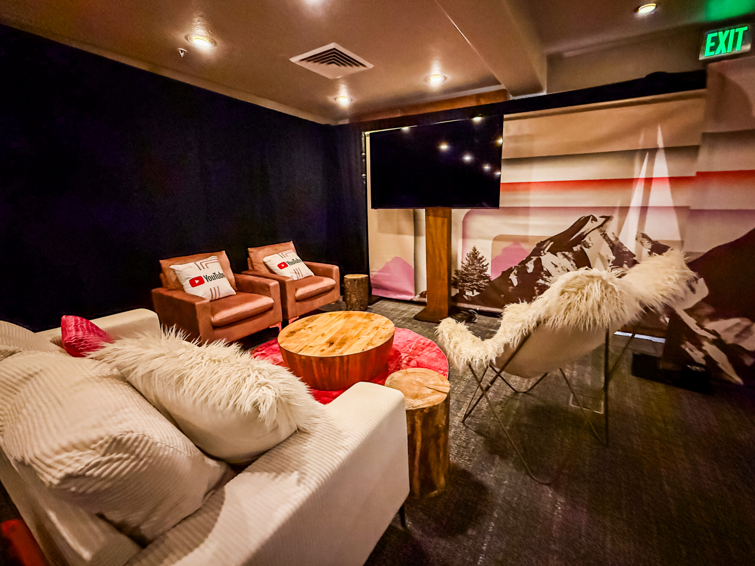 Fun YouTube lounge with winter themed decor and large snow goggle photo op.