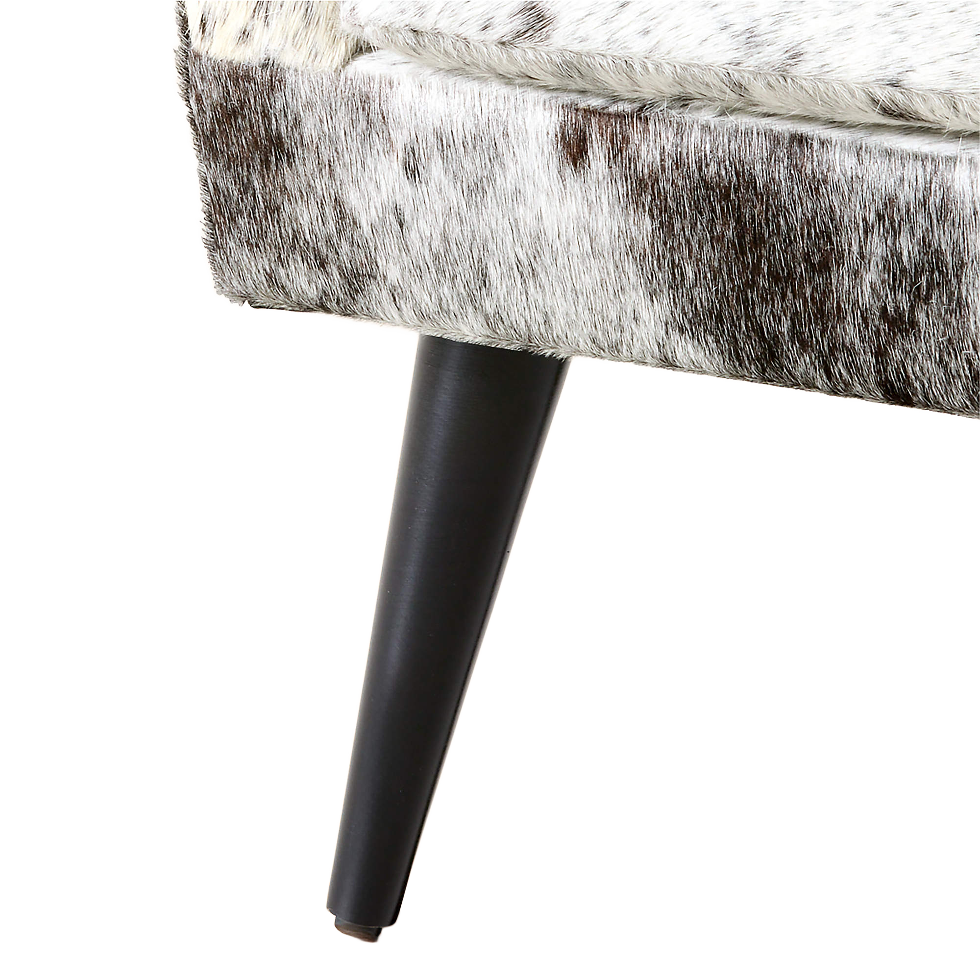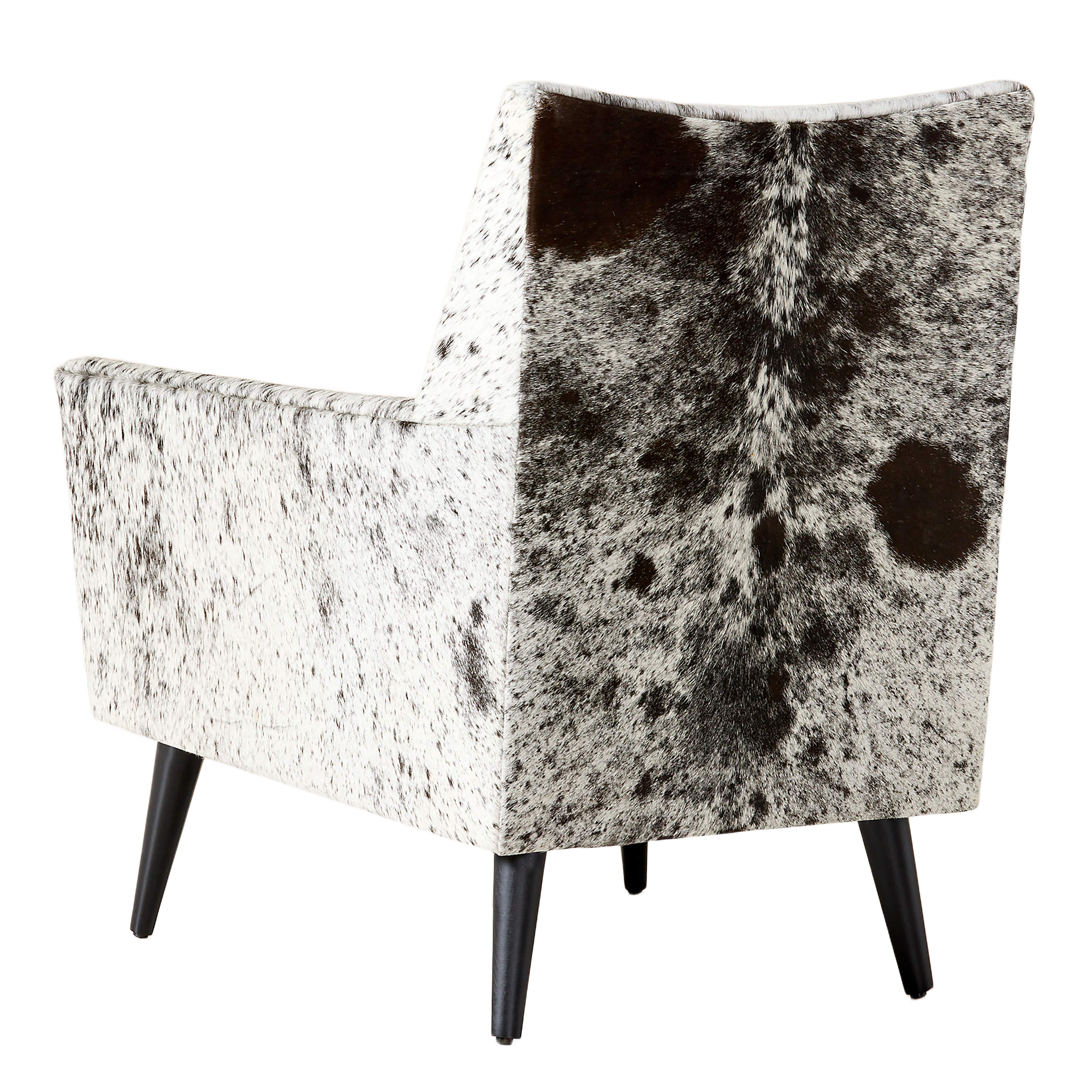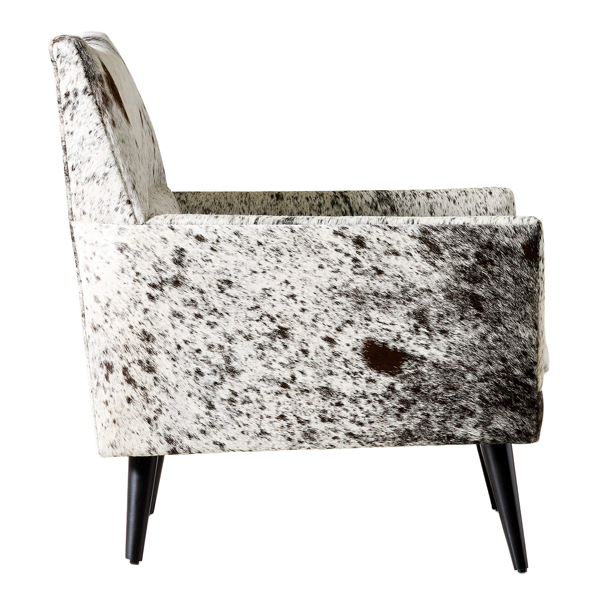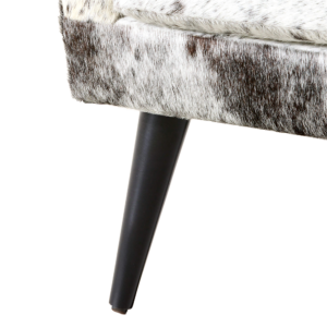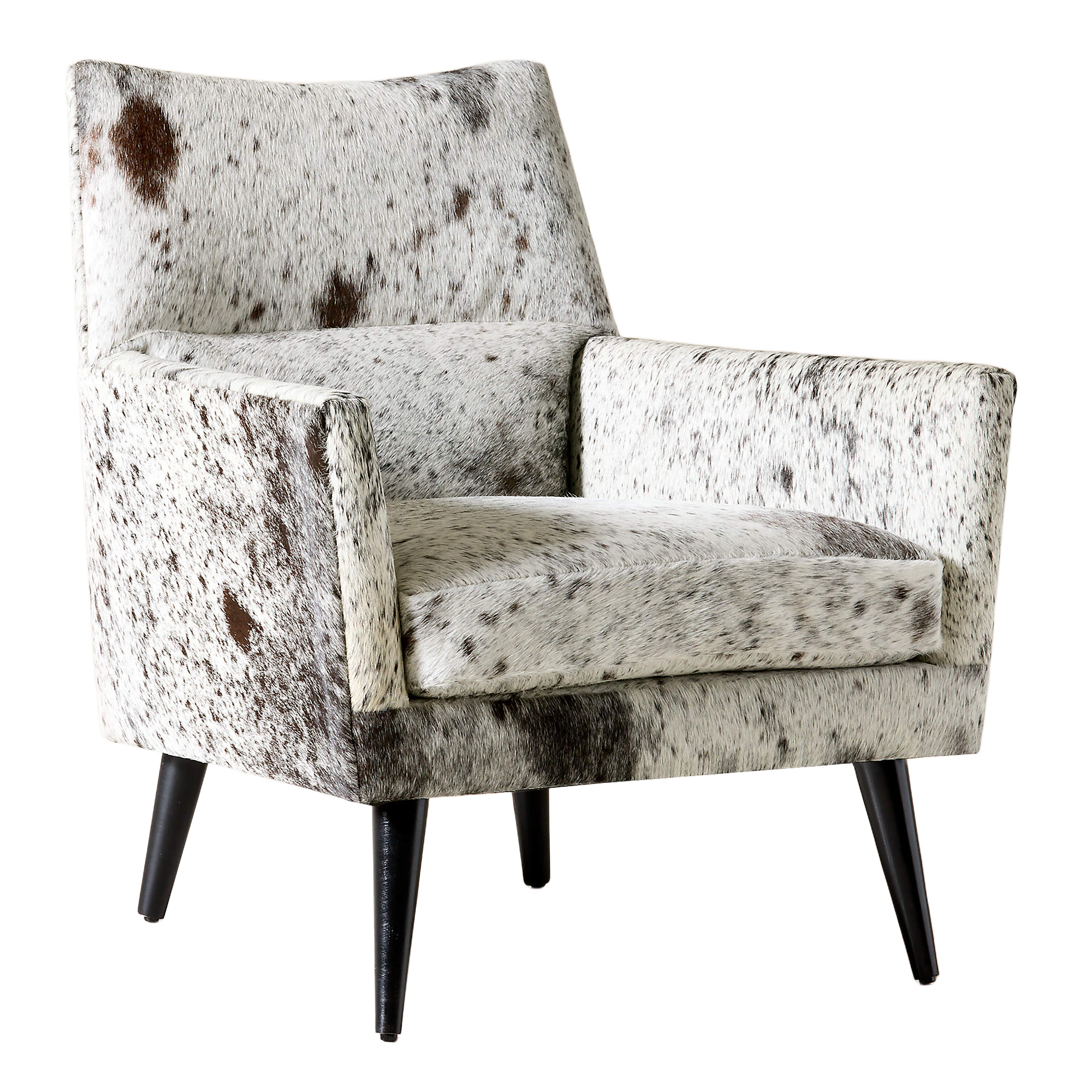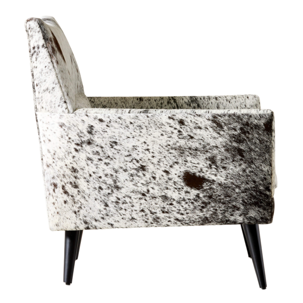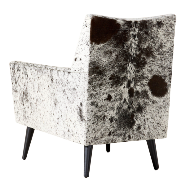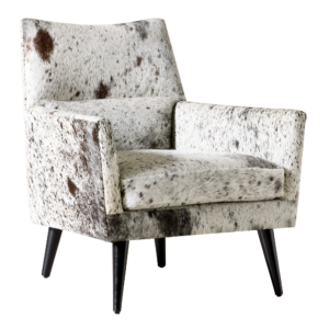The Ferron Arm Chair pairs bold materiality with a refined, architectural silhouette. Upholstered in cowhide with natural variation in pattern and tone, each chair offers a distinctive look that adds texture and visual interest to any setting. Clean lines, structured arms, and a gently angled back create a tailored yet inviting profile, while tapered legs introduce a subtle mid-century influence.