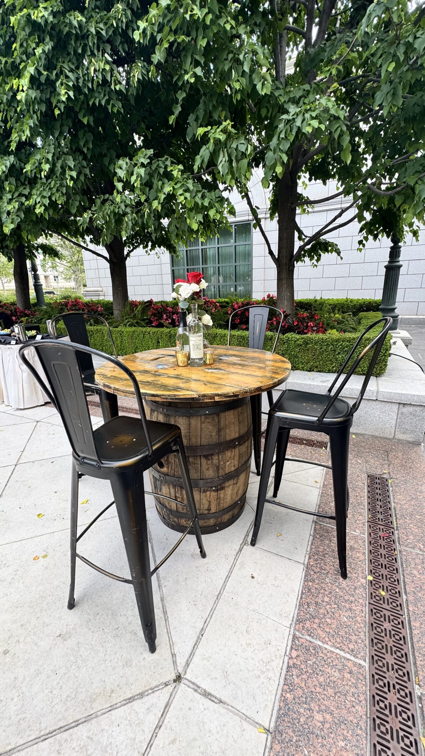 A charming rustic barrel table paired with industrial black chairs, styled with floral décor for outdoor events or cocktail receptions — available from In The Event.