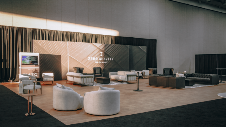 Branded lounge area featuring comfortable seating and custom event backdrops.