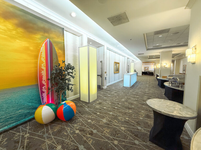 Coastal-inspired event setup featuring a tiki umbrella, lifeguard stand, and tropical accents.