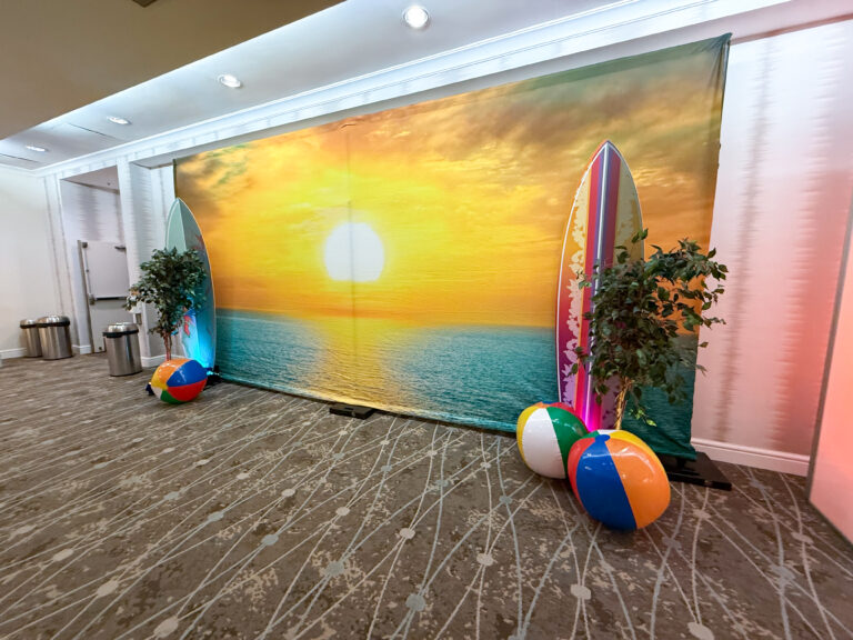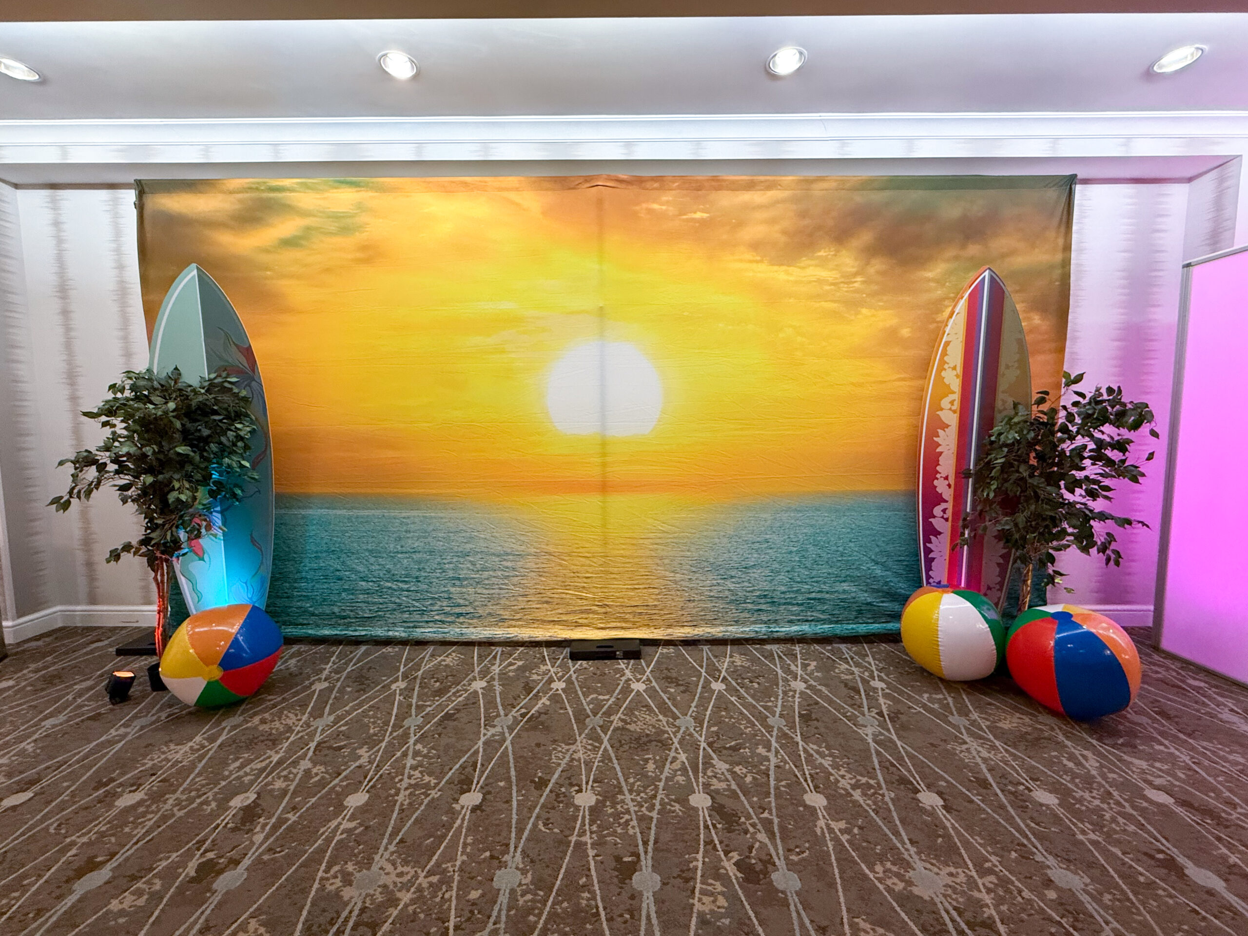Tropical sunset backdrop with surfboards makes for a fun tropical photo op for guests.