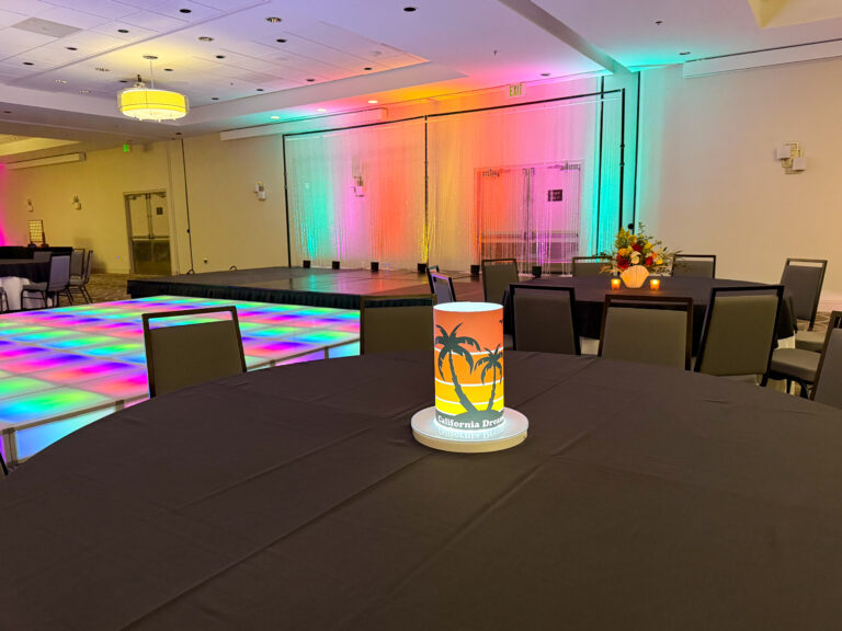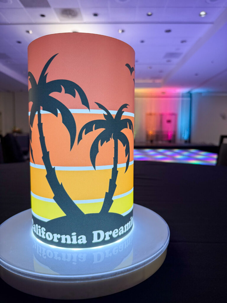 Tropical-inspired event décor featuring colorful painted palm leaves, adding a vibrant and festive atmosphere to the space.