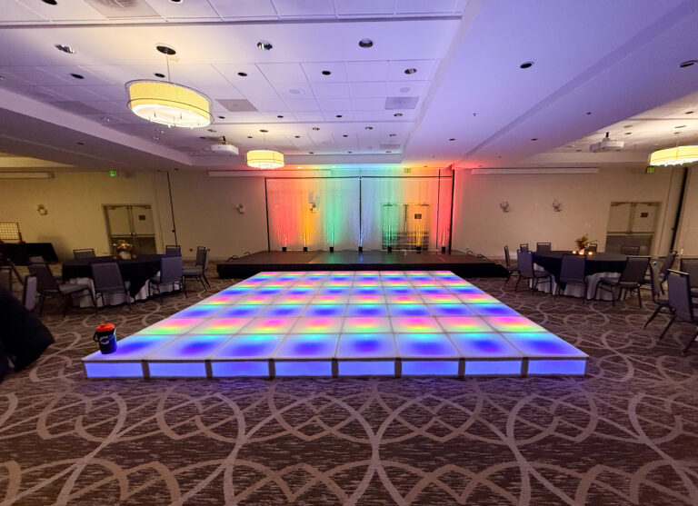 Vibrant tropical lounge scene with colorful lighting, perfect for photo opportunities at events.