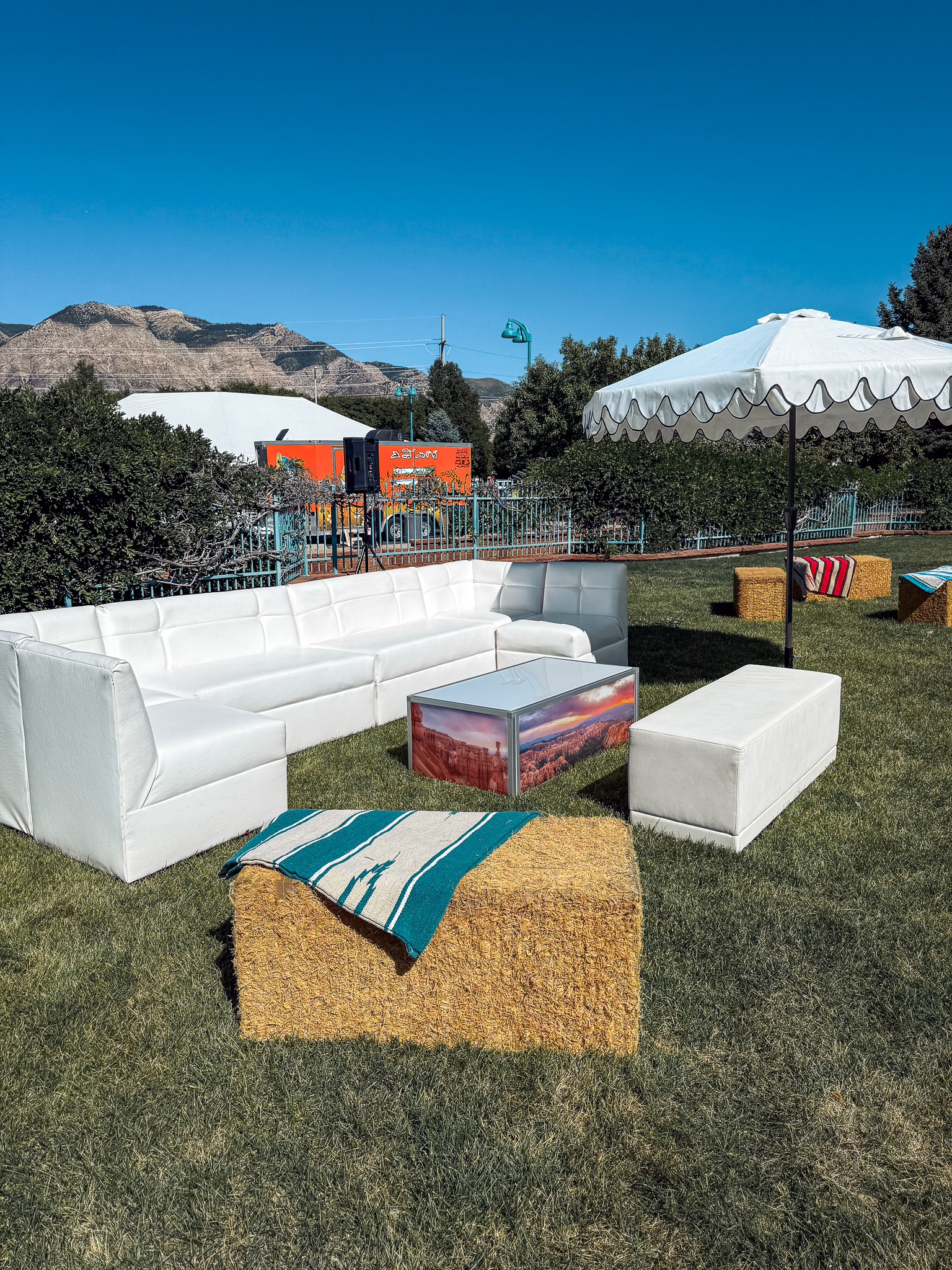 Comfortable and stylish outdoor lounge area featuring modern seating mixed with fun, rustic event props.