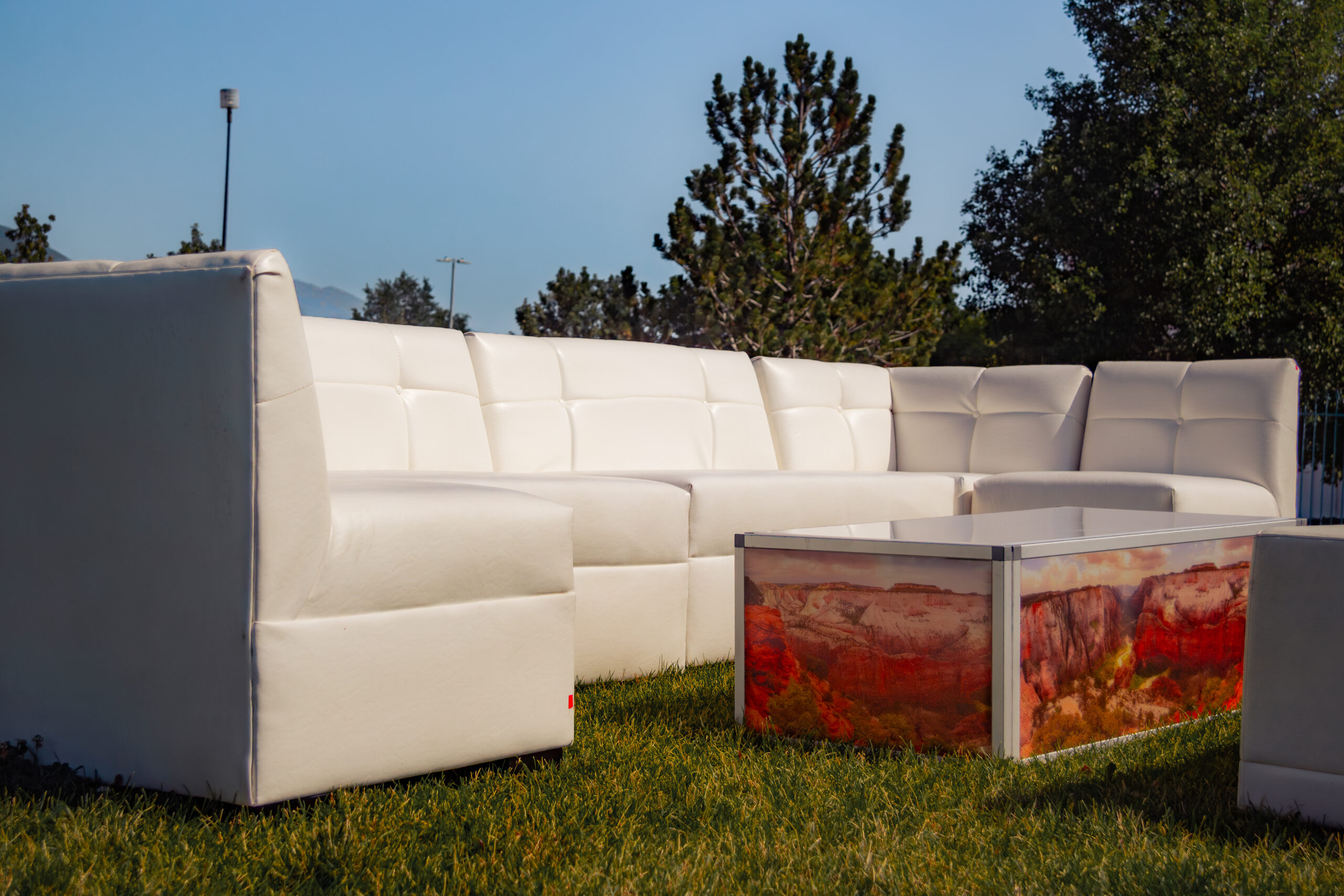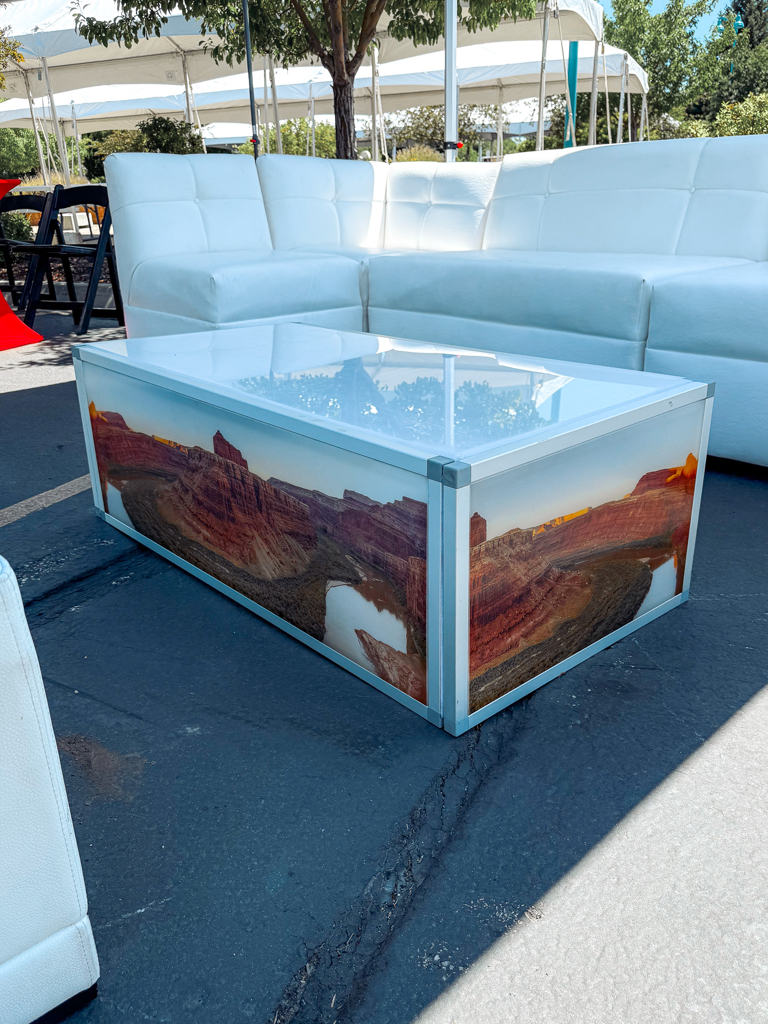 Showcase custom branding or beautiful scenery with our graphic-wrapped coffee tables.