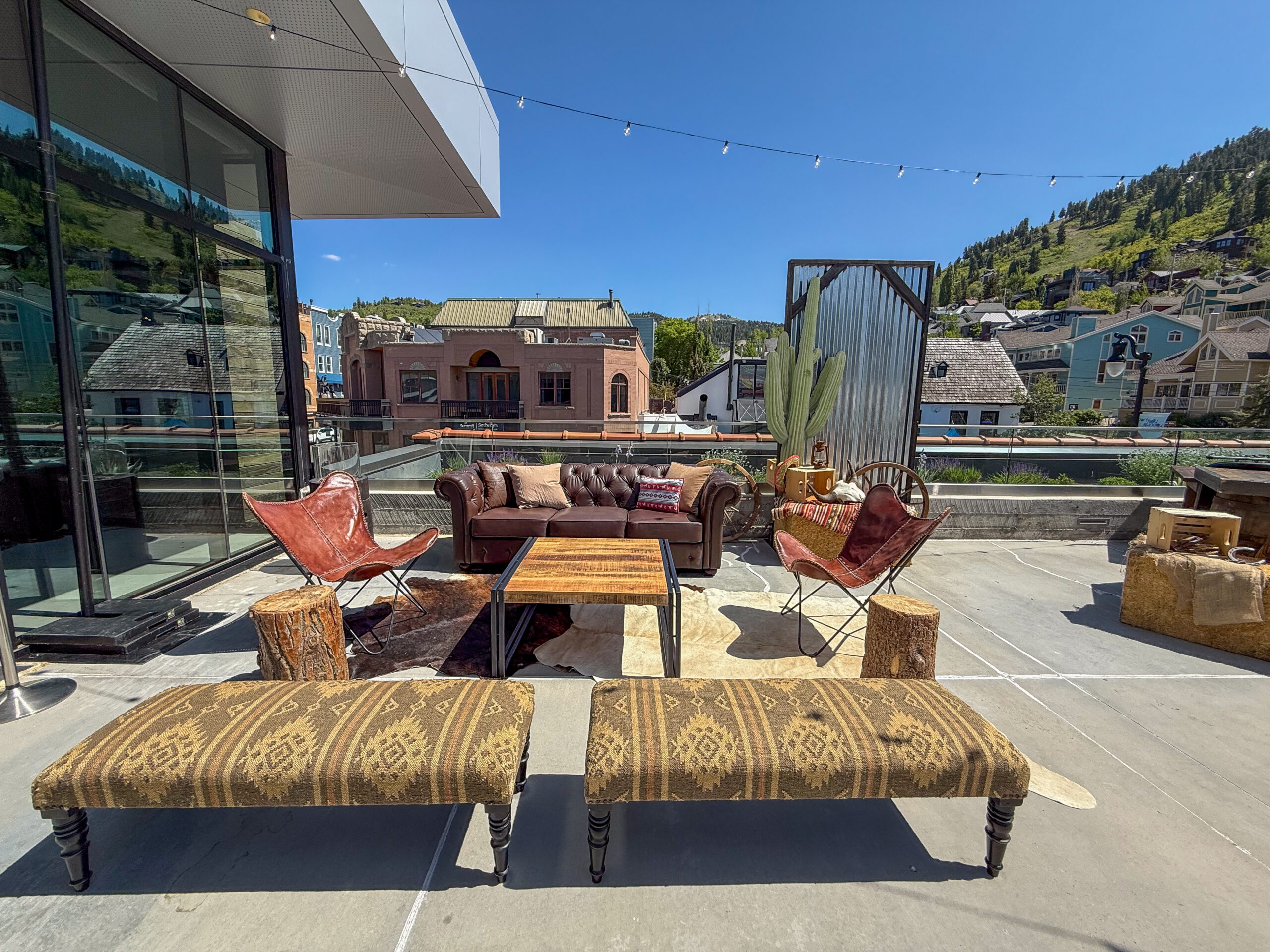 Inviting rooftop lounge styled with rustic Western elements, including leather seating and patterned textiles — a sophisticated outdoor setup by In The Event.