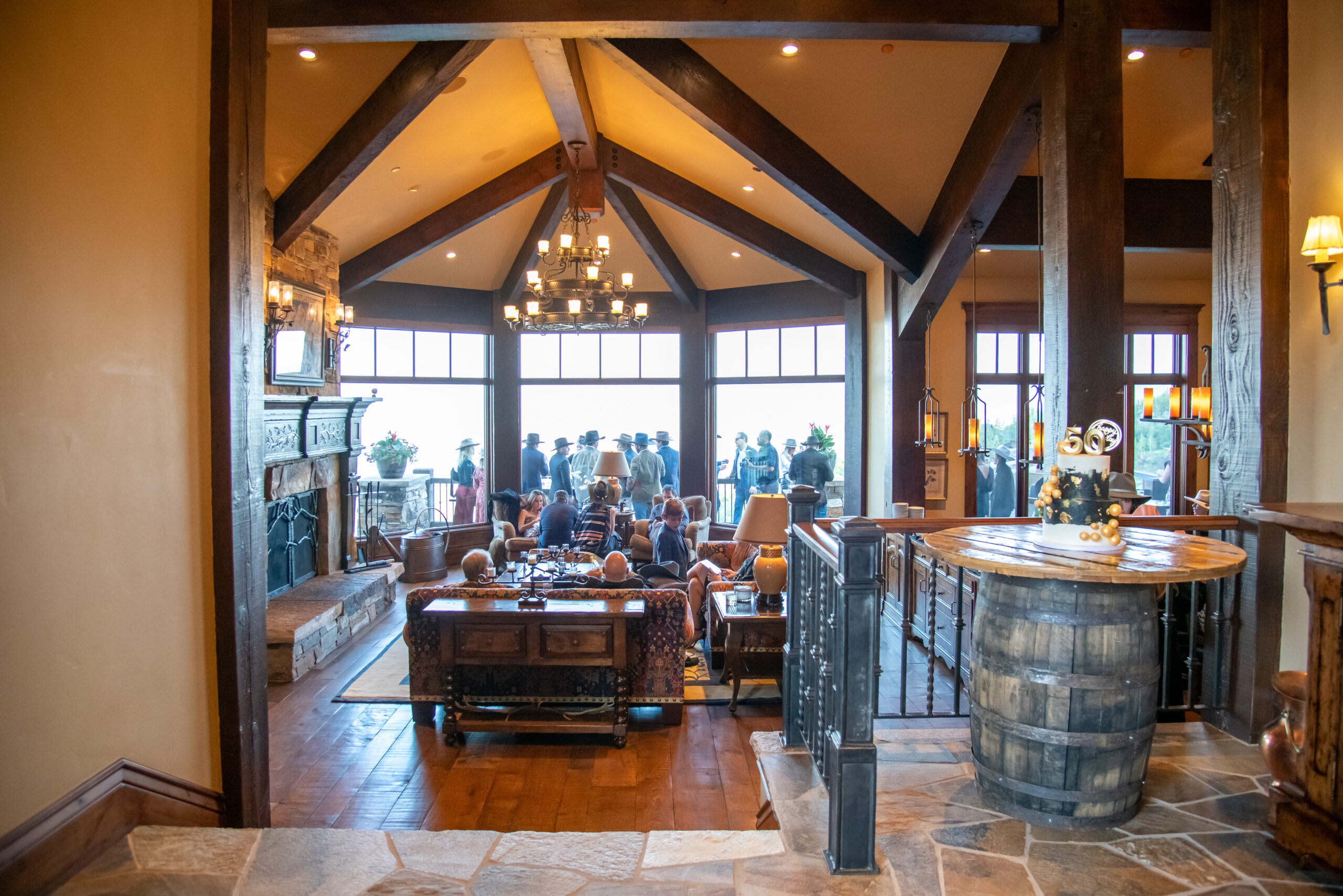 Cozy mountain lodge setting featuring warm lighting, rustic furnishings, and a barrel table cake display — stylish Western-inspired event by In The Event.