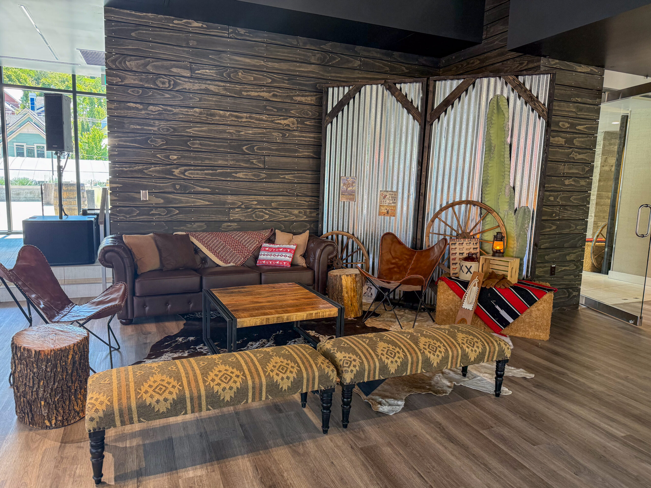 Western themed lounge area with cowhide throws.